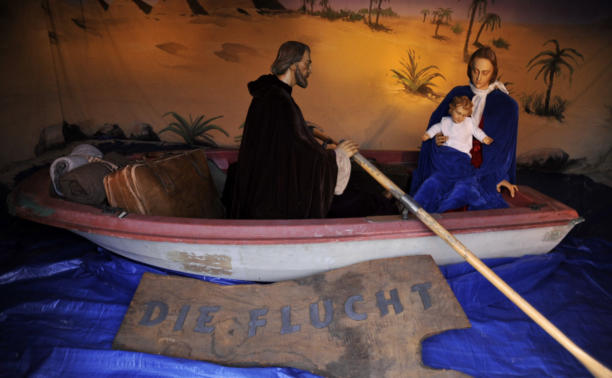 Mit dem Jesuskind fliehen sie in einem kaum seetüchtigen Boot übers Meer.